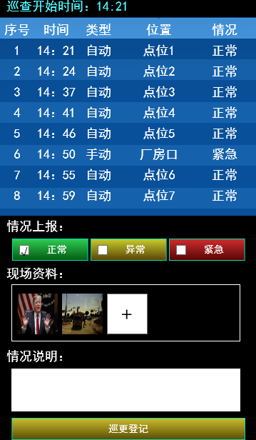 查看當(dāng)前經(jīng)過的巡更位置,以及登記的巡查結(jié)果。巡查結(jié)果登記時分為正常、異常、緊急。并可以拍照或視頻上傳,在情況說明中注明問題。系統(tǒng)自動記錄地點為最近當(dāng)前經(jīng)過的巡更點。